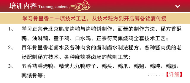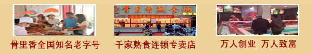 熟食卤菜的航母,美味、绿色、健康尽在骨里香熟食城 骨里香连锁总部,由江南卤水名师戴骁强先生创立,骨里香卤菜在配方上,挖掘历代药膳之精华,根据卤料配方加之八种优质香辛料配制,融传统和现代工艺为一体,精心选料,通过高温杀菌,使骨里香熟食具有味正香醇,色鲜嫩烂之特点,骨里香系列食品绝不含任何化学色素,不销售隔夜产品,保证美味产品天天新鲜,是老少皆宜的美食佳品。   骨里香烧鸡历史典故 相传清朝... [详细]